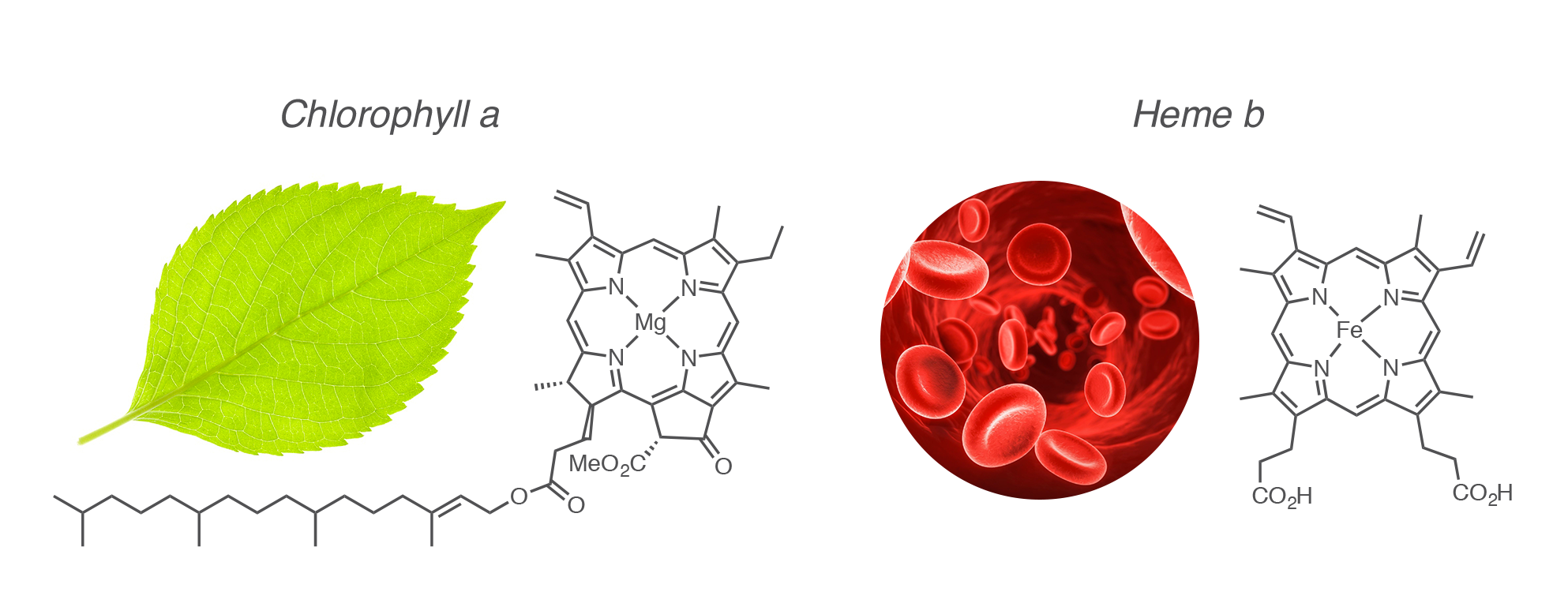 In nature, porphyrins and related tetrapyrrolic derivatives are involved in major life processes such as photosynthesis and the respiratory chain. Excellent chelating agents, they are involved in these processes through their metal complexes. The chlorophyll, a partially reduced magnesium(II) porphyrin, is the main actor of the conversion of the sunlight energy into chemical energy in photosynthetic organisms. The heme, an iron(II) porphyrin, is the active site of hemoglobin responsible for the transportation of dioxygen in erythrocytes (red blood cells); Heme is also involved in myoglobin responsible for the storage of dioxygen in muscle cells as well as in a, b and c cytochroms, which serve as redox intermediates in electron transfer processes.